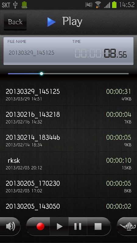 녹음이 완료되면 리스트 형태로 녹음 제목, 날짜, 녹음 시간, 용량을 표시하고