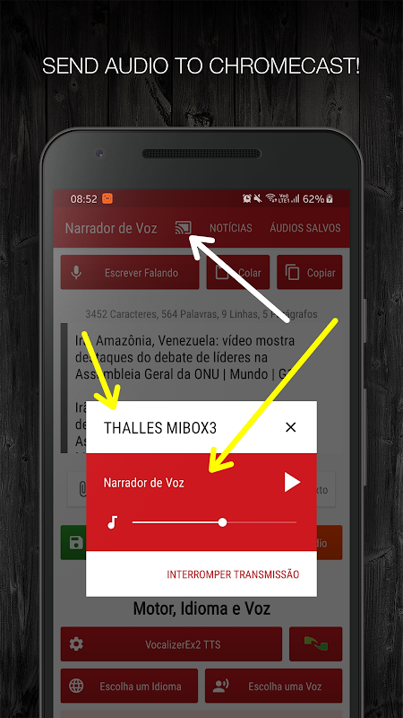 - You can send any Audio to Cast devices connected on your Wifi network, Giant Audios or just a Hi!