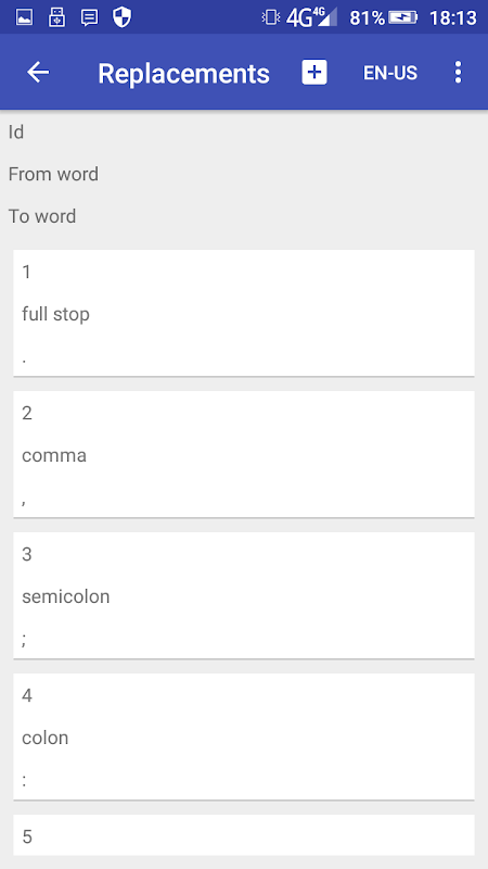 음성 입력을 위한 대체 가능한 단어 및 구두점 목록을 사용자 정의할 수 있으며, 연속 음성 인식, 대문자 사용 제어, 마지막 음성 입력 취소 명령(버튼 또는 음성으로 실행)을 지원합니다.