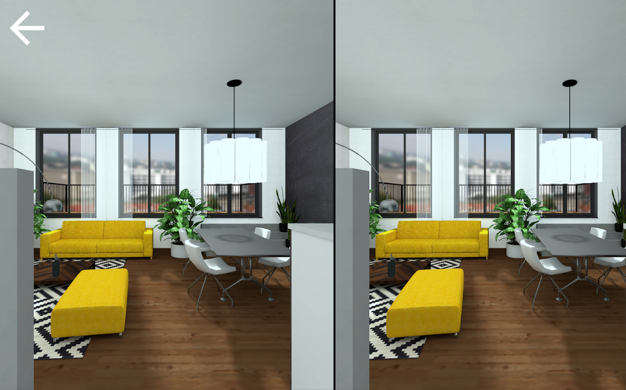Beleef dit appartement in virtual reality: met bijvoorbeeld een Google Cardboard staat u echt in de woning en kunt u er doorheen lopen. Tussen lopen en stilstaan wisselt u door naar beneden te kijken. Het verkeersbord geeft aan in welke stand u zich bevind.