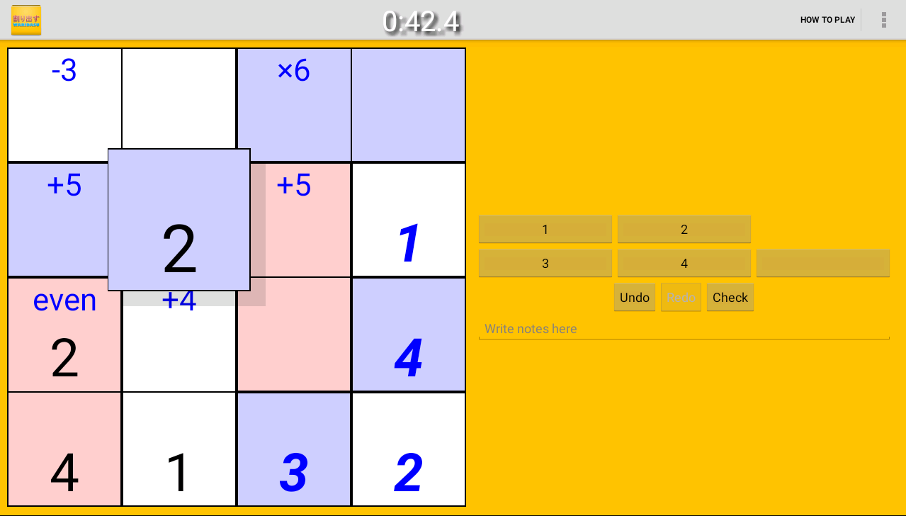 If you enjoy KenKen or Mathdoku, you'll love Waridasu. The odd/even clues and the unique Mesh mode take it to a new level.