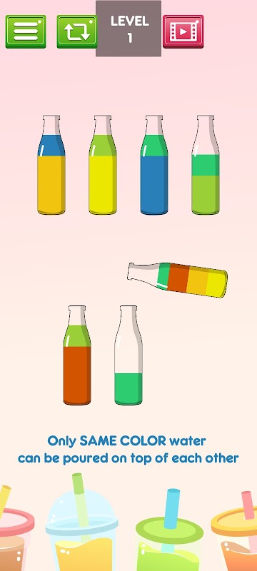 규칙은 같은 색에 연결되어 있고 유리 병에 충분한 공간이 있는 경우에만 다른 병에 물을 부을 수 있다는 것입니다.