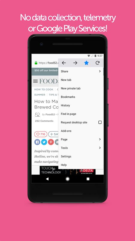 No data collection, no telemetry and no Google Play Services! A browser that truly cares about your privacy.