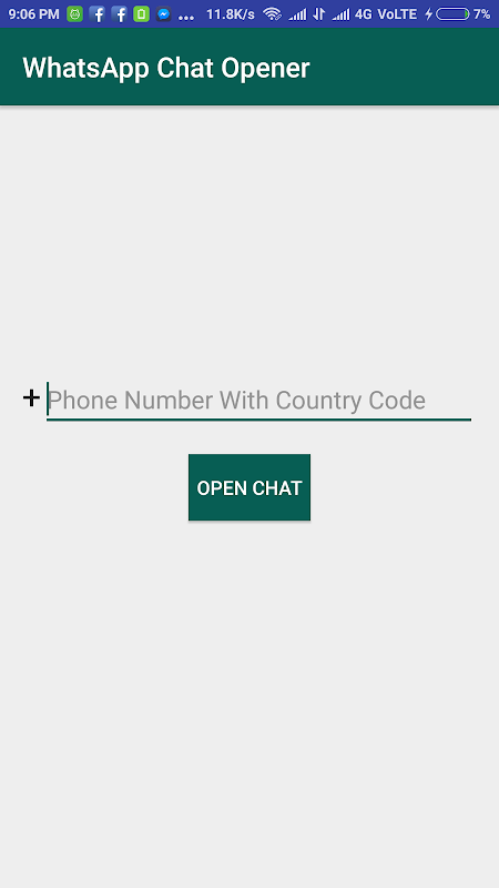 This is a simple app which allows you to pen any chat in WhatsApp without saving number. now you don't need save the contacts in your phone to chat with the owner of that number. simply enter the number with country and chat with the person
