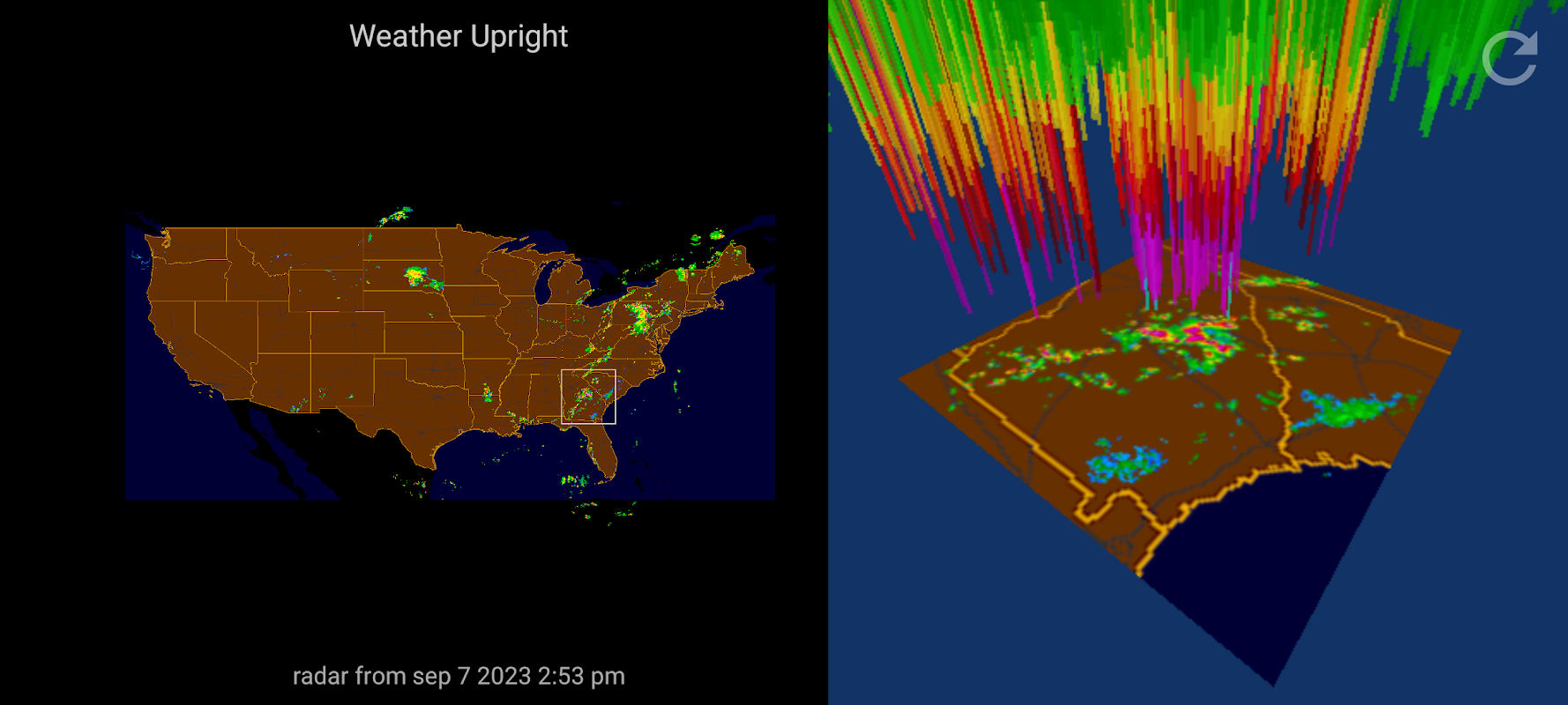 지금까지 강수량에 대한 거의 모든 레이더 이미지는 평면도였습니다! 해당 지역(또는 미국 본토 어디든)의 레이더를 측면에서 확인하세요! 확대/축소하고 회전할 수 있습니다. 이 특별한 보기에서 해당 지역을 보려면 지도의 아무 곳이나 탭하세요! 실시간 NOAA/NEXRAD 레이더 이미지를 기반으로 사용하고 독점 렌더링 프로세스를 통해 이를 3D로 표시합니다!