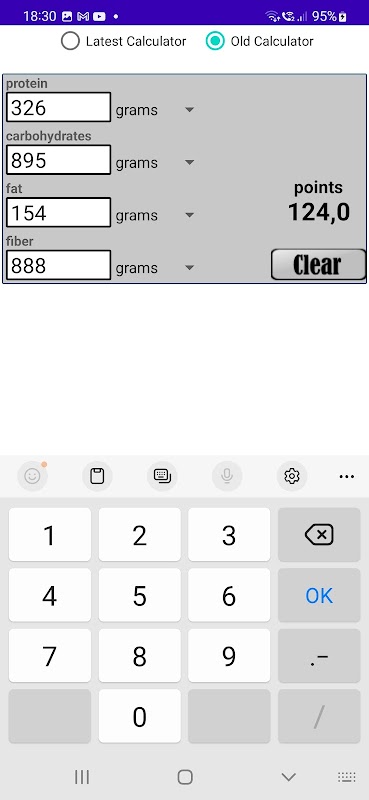 구형 계산기(2015년 12월까지 사용) - 포인트는 단백질, 탄수화물, 지방 및 섬유질을 기준으로 합니다.