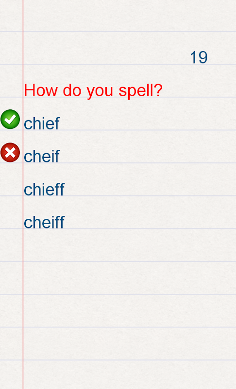 각 라운드는 20 개의 질문으로 구성됩니다. 까다로운 단어를 철자하는 4 가지 방법이 있습니다.