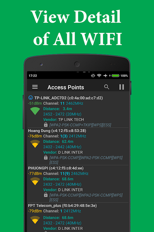 이 응용 프로그램은 범위의 모든 사용 가능한 무선 네트워크를 스캔하고 같은 그들에 대해 당신에게 정보를 보여줍니다 :