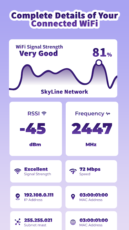 신호 강도, 연결 속도, 주파수, 안정성 등 WiFi 신호에 대한 자세한 정보를 실시간으로 확인하세요.