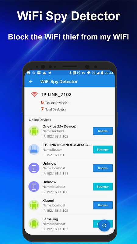 내 WiFi를 쉽게 스캔하고 WiFi 네트워크에 연결된 장치 수를 확인하세요. '알려진 사람' 또는 '낯선 사람'으로 표시하거나 WiFi 라우터에서 차단할 수 있습니다.