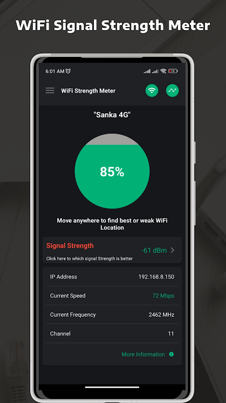 WiFi 신호 강도 측정기는 WiFi 신호 강도를 지속적으로 업데이트하므로 최고의 WiFi 신호 강도로 강력한 WiFi 신호를 쉽게 찾을 수 있습니다. 이는 WiFi 신호 강도에 대한 최상의 경험을 제공하기 위해 수행됩니다.