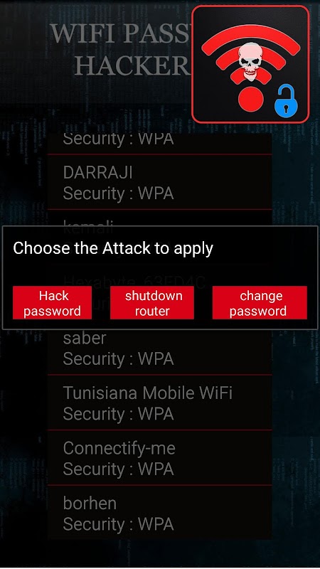 Wifi Password Hacker application simulator allows you to pretend to hack the password of all available networks and gain the internet access for free.