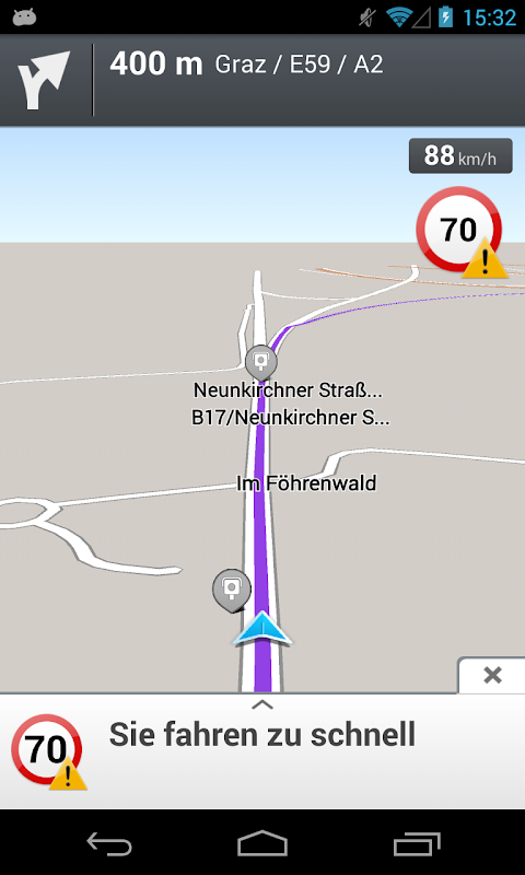 Voice and visual guidance in 3D view, speed camera warnings and live traffic information.