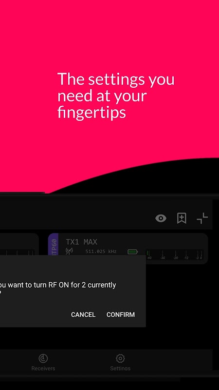 상태에 대한 일반 정보를 방송하는 Wisycom 장치를 스캔하고 장비를 관리하세요. 앱을 실행하여 배터리 잔량, 채널 이름, RF 및 오디오 레벨, 채널 그룹, 주파수 등을 포함한 매개변수를 모니터링하고 제어하세요.
