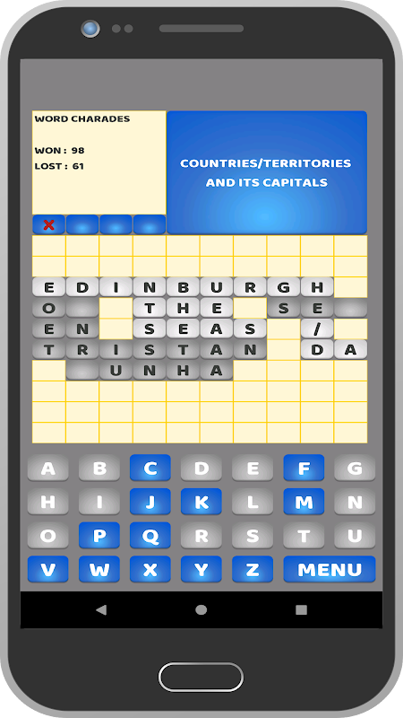 "Word Charades" is a remake of the popular traditional word guessing game, tailored to current technology and taste. Guess the letters and see the answer magically revealing itself for every correct guess. Various different topics like capitals, countries, proverbs, world holidays, sports teams, sports icons, songs, movies, birds, animals, universe and much more, are packed in to this small but powerful game. Keep yourself engaged, and also learn surprisingly new words, sentences and what not. Future releases to contain variety of new topics.