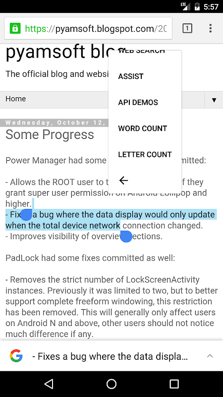 Using Android Marshmallow's new ability to include custom entries into the Text Selection menu, WordWiz compliments the Android system by adding the ability to quickly get a word count on a selection of text.