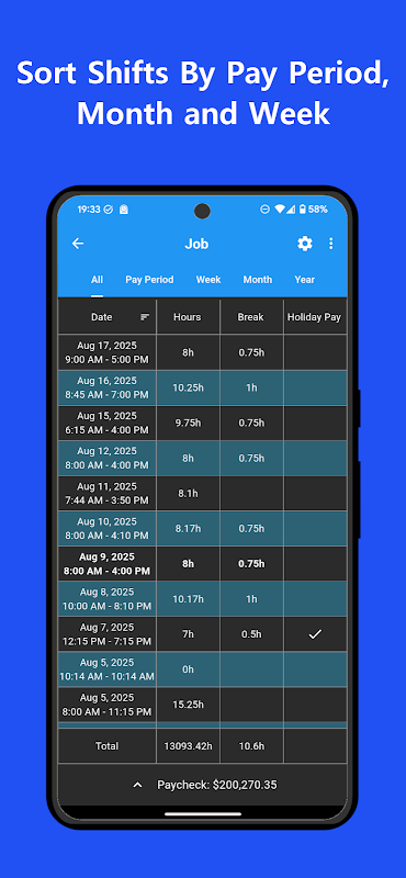 • 급여 기간을 설정하여 일한 시간과 각 급여 수표에 대한 급여를 자동으로 계산합니다.