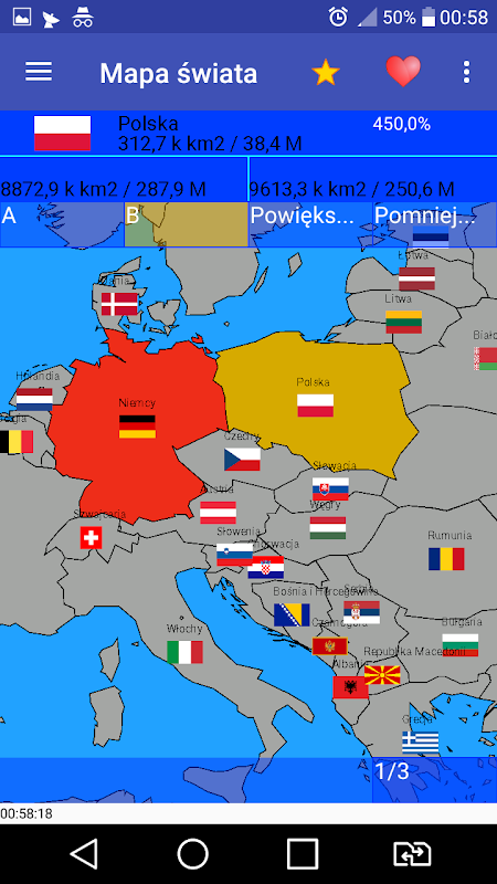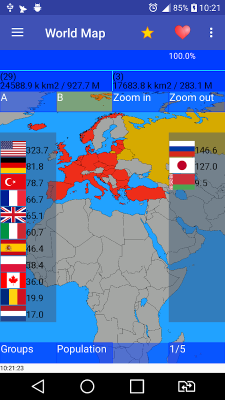 내가 당신에게 세계의지도를 포함하는 응용 프로그램을 제시한다. 면적과 인구 : 각 국가의 데이터가 있습니다.