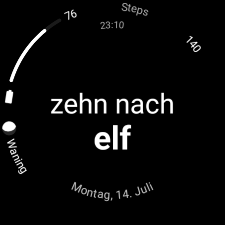 Wear OS용 이 시계 화면은 "5시 20분"과 유사한 대략적인 텍스트 형식으로 시간을 표시합니다.