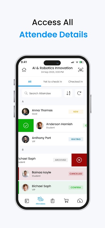 이 응용 프로그램을 사용하면 참석자가 오른쪽으로 살짝 밀어 이벤트에 쉽게 체크인할 수 있으며 녹색 및 빨간색 표시기로 체크인 및 체크아웃에 대한 최신 정보를 확인할 수 있습니다.