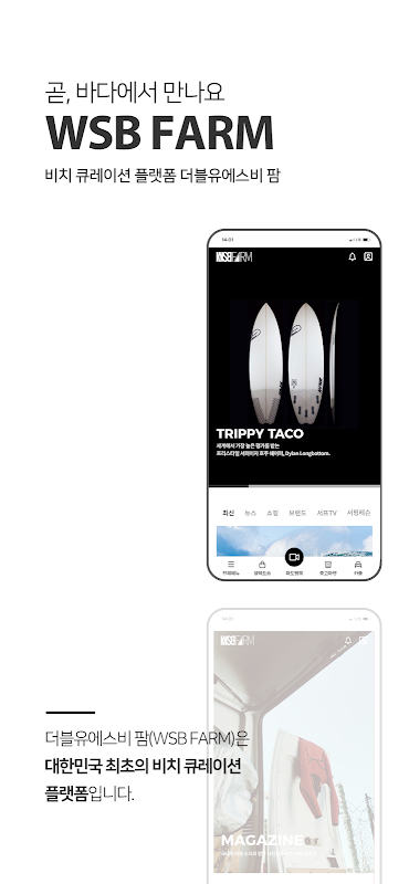 더블유에스비 팜(WSB FARM)은 서핑 라이프를 위한 대한민국 최초의 비치 큐레이션 플랫폼입니다.