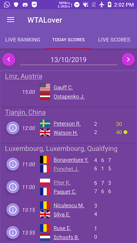 WTALover 앱은 WTA 테니스(여자 테니스 협회) 팬을 위한 앱입니다. 열정적인 테니스 팬으로서 저는 경기 일정, 토너먼트 정보와 대진표, 통계, 실시간 순위(플레이어를 위한 최상의 시나리오 포함), 실시간 경기 세부 정보, 플레이어 프로필을 모두 클릭 한 번으로 원활하게 결합하는 앱을 구상했습니다.