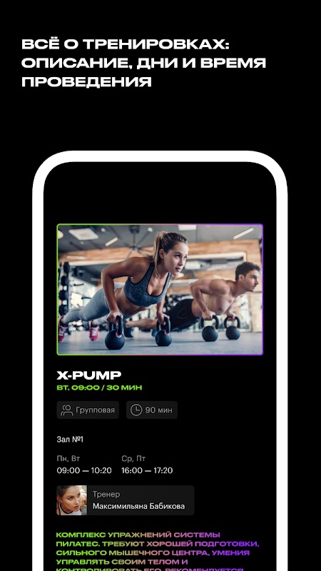 - видеть оповещения о предстоящих занятиях и обо всех изменениях в клубе;