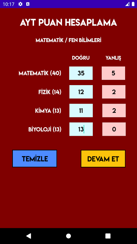 YKS 점수 응용 프로그램을 사용하면 원하는 점수 유형 (TYT, SAY, SÖZ, EA)에 따라 해결 한 평가판 시험의 점수와 예상 순위를 알 수 있습니다.