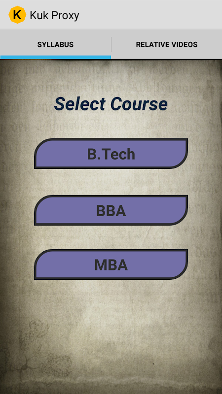 Through this application you can browse Kurukshetra University syllabus for three courses- B.Tech, BBA and MBA.