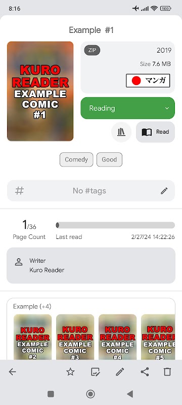 • Wide file support: cbz, cbr, cbt and cb7. Including support for standard archive formats: zip, rar, tar, 7z