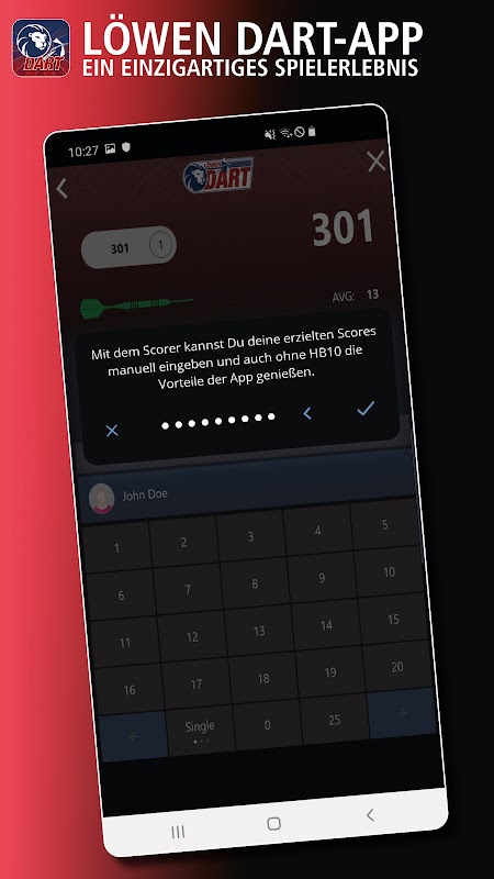 Enjoy the advantages of the LÖWEN DART app. To do this, all points scored can be recorded manually in the app and all statistical data can be accessed as usual.