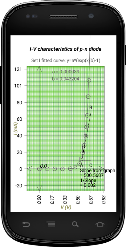* Once the plotting and fitting is done, double tap on any point on the fitted curve to observe and display the corresponding X-Y point. Perform a slope calculation at that point by drawing a tangent and a right-angled triangle, just as you would do using a conventional graph paper. Also obtain Y value(s) at any X value and X value(s) at any Y value from the fitted curve.