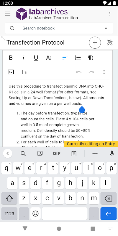 This mobile app delivers desktop LabArchives ELN functionality in a mobile-friendly way to Android phones and tablets. Take advantage of innate mobile features to dictate text entries, add images, video, and audio files in addition to all the tools LabArchives ELN provides.