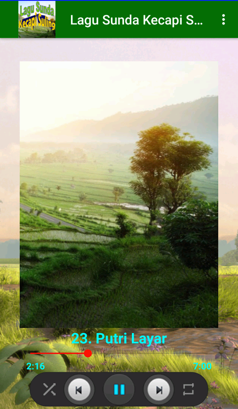 Presented an application for lovers of Sundanese culture - especially the traditional Sundanese art of music. Presented the best collection of Sundanese songs accompanied by Kecapi Suling. Install and enjoy the magical nuance of Pasundan land that always soothes the soul. Enjoy classical Sundanese songs accompanied by traditional West Javanese musical instruments such as Twin Campaka, Mangu-Mangu Goyong, Putri Layar, Jalir Jangji, etc.