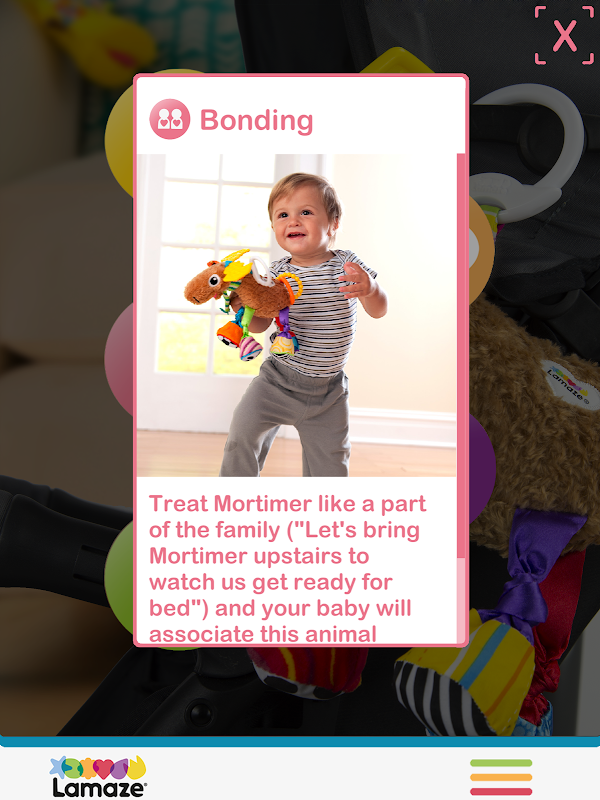 • Use your device’s camera to detect a target marker included with your Lamaze toy. Activate videos or text that detail how the features of the toy are beneficial for baby, and how to use the toy to engage baby and make playtime special for both of you