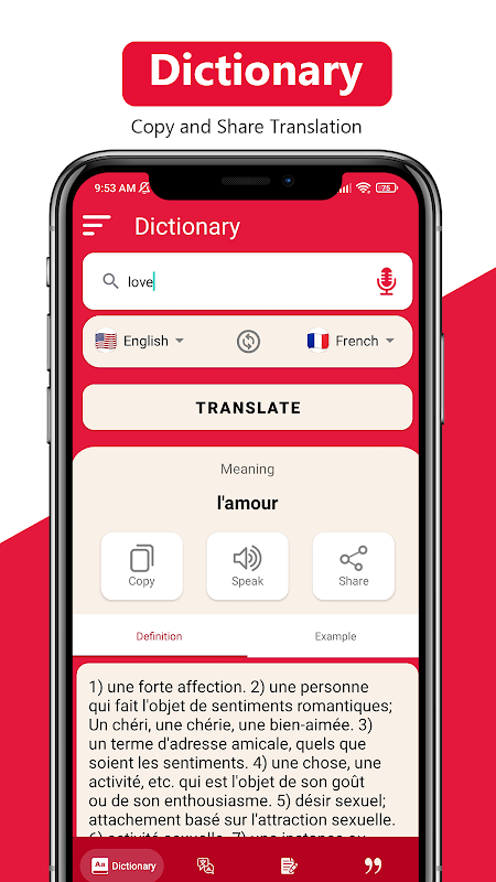 If you're looking for a straightforward English translation app that will translate your text into any language you like Install all language translator app to receive translations in practically all languages without worrying. Moreover, it also includes the English Dictionary. So, speak and translate with definitions and examples.
