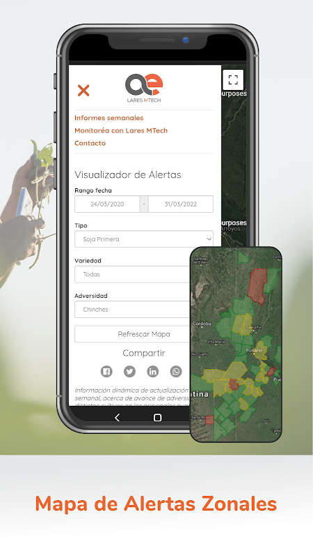 Lares MTech is an intelligent system for the collection, registration and analysis of field monitoring that contributes comprehensively to decision-making for managing and controlling adversities in extensive crops.
