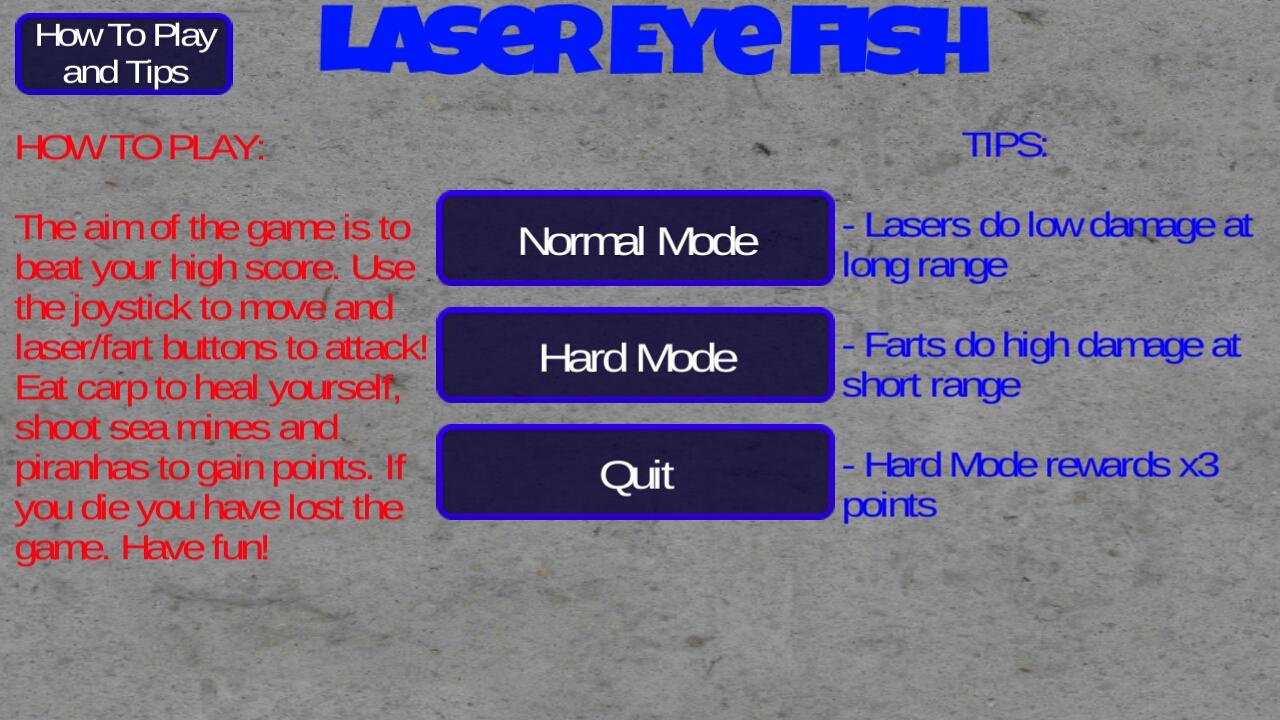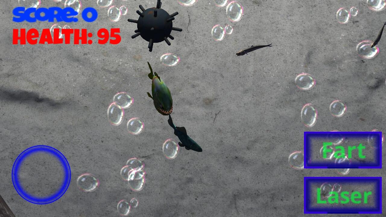 The aim of the game is to beat your high score. Use the joystick to move and laser/fart buttons to attack! Eat carp to heal yourself, shoot sea mines and piranhas to gain points. If you die you have lost the game. Have fun!