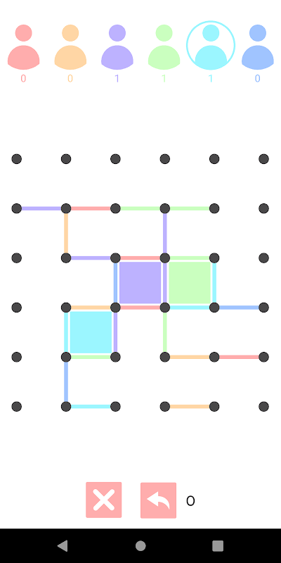 Last Draw 2 is an intellectual game that can be played by up to 6 people at the same time. Starting the match, you will choose the number of players and size as the chess board, then each player will connect 2 points together to form an edge and whoever creates the last edge to form a square is that player. Points will be scored and play continues. When all edges on the board are connected, the game will end and display the board results for each player