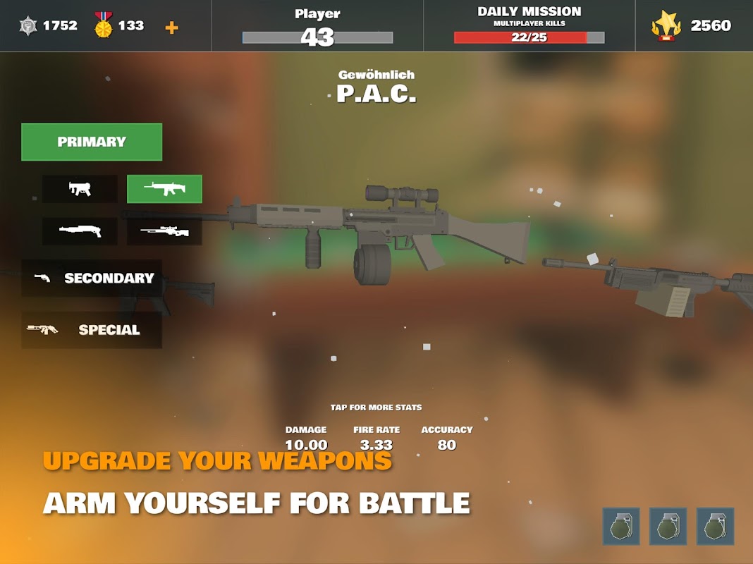 Unlock different weapons you can buy with gold and silver medals. Weapons differ in damage, fire rate, accuracy, magazine size, number of magazines and their articles.