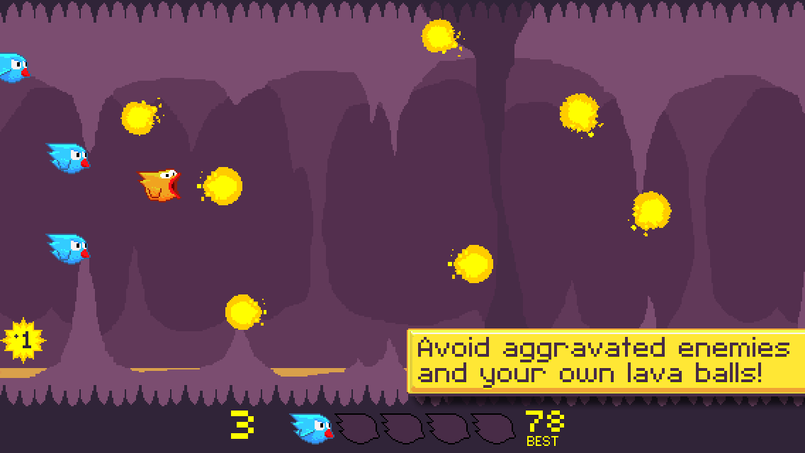 You are a bird with an unfortunate medical condition that causes you to spew lava balls with every flap of your wings. Tap to fly. Avoid enemies, spikes, and your own fiery spit balls in this neverending flying game.