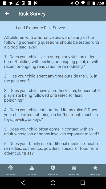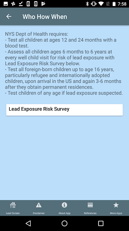 Lead Screen presents guidance for clinicians on lead poisoning screening in children based upon the New York State Department of Health guideline of October, 2011. It puts at your fingertips information on whom to screen, how to screen, what to do with various levels of blood lead level test results, signs & symptoms of lead poisoning, lead exposure risk factors, assessment for elevated levels, and a discussion of variations among guidelines on this topic.