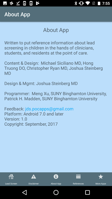 This app is written and intended for practicing clinicians who provide primary care for children including pediatricians, family physicians, nurses, PA's and NP's; for resident physician trainees; and for medical students. The app was prepared in collaboration with the Broome County Department of Health, Broome County, NY. As an educator and clinician, I am interested in feedback and I would be grateful for guidance on improving this guide.