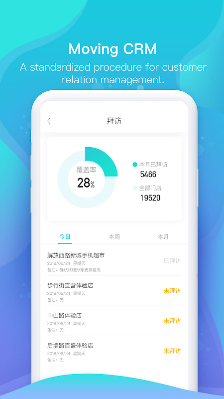 3.Store visit: Salesmen can create a visit plan at any time and forming a visiting history by click the visit plan for automatically localizing and recording time. Each head can inquire the visit coverage of each region and each salesman, as well as the visit details.