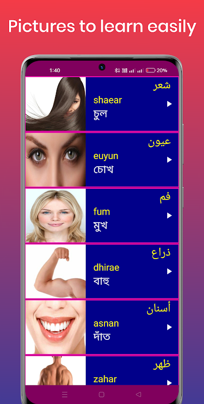 2. Each Arabic word has a clear image 📸🖼️ and audio pronunciation 🎵🔊 to make Learning Arabic via Bangla Easy.