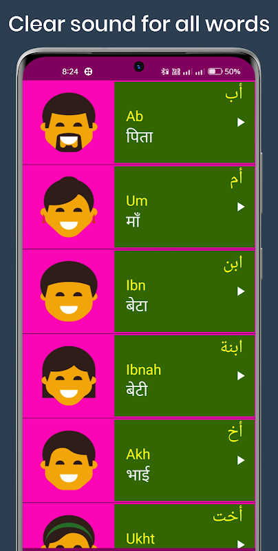 2. Each Arabic word has a clear image 📸🖼️ and audio pronunciation 🎵🔊 to make Learning Arabic via Hindi Easy.