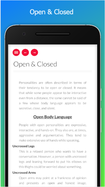 This FREE app will help you to understand Body Language properly and teach you about how to Start Learning using Body Language. Here we are covering almost all Tips for several Body Language Usage for different occasions. The sequential tutorial let you know from basic to advance level.