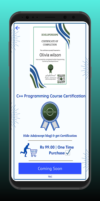 “Learn C++” app has a really simple and intuitive user interface. It is the best app to let you learn the C++ programming language for free. So, what are you waiting for? Download the app now to become an expert at C++ Programming Languages