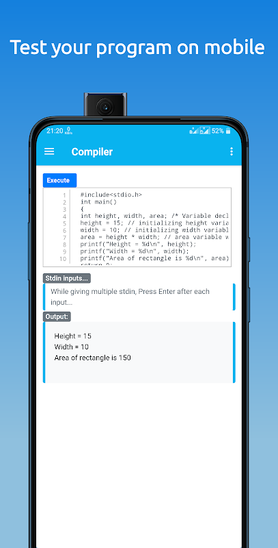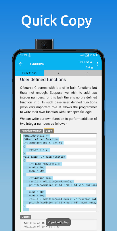 You can even copy and Compile the program without doing any efforts. This Learn C Application has in build Compiler and "copy" function for each Example of C program.