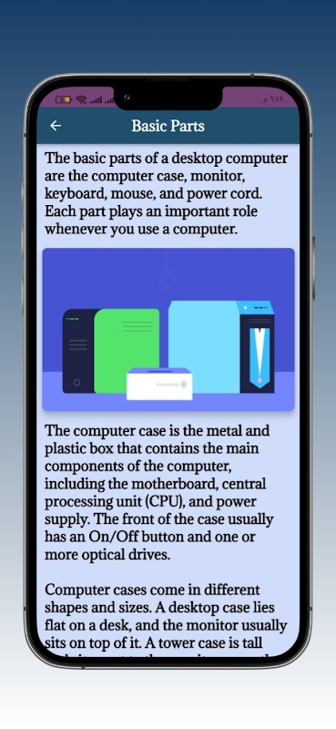 The "Learn Computer Basic" app is a mobile application designed to provide education and resources for individuals who want to learn the fundamentals of using a computer. The app is aimed at beginners with little or no prior experience with computers.